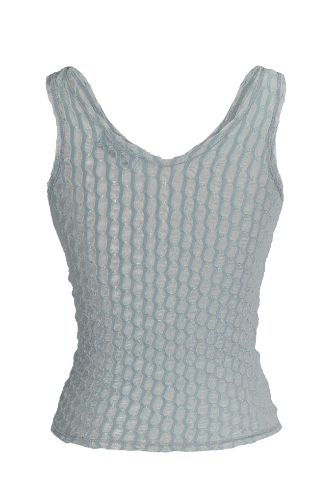 A baby blue knit tank featuring an oval stripe texture with a subtle sheen - reminiscent of dew drops. Styled with the Liu Capri in Cream.