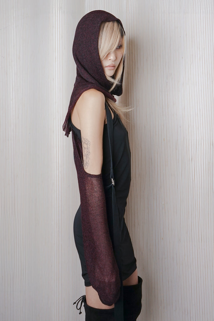 Cozy arm warmer sleeves that can be worn like a backpack. Details include extra long sleeves with a raw distressed hem. The sleeves hang off-shoulder, but can be worn higher on the arms depending on the strap placements. Adjustable silver hardware at the center back and on the straps.